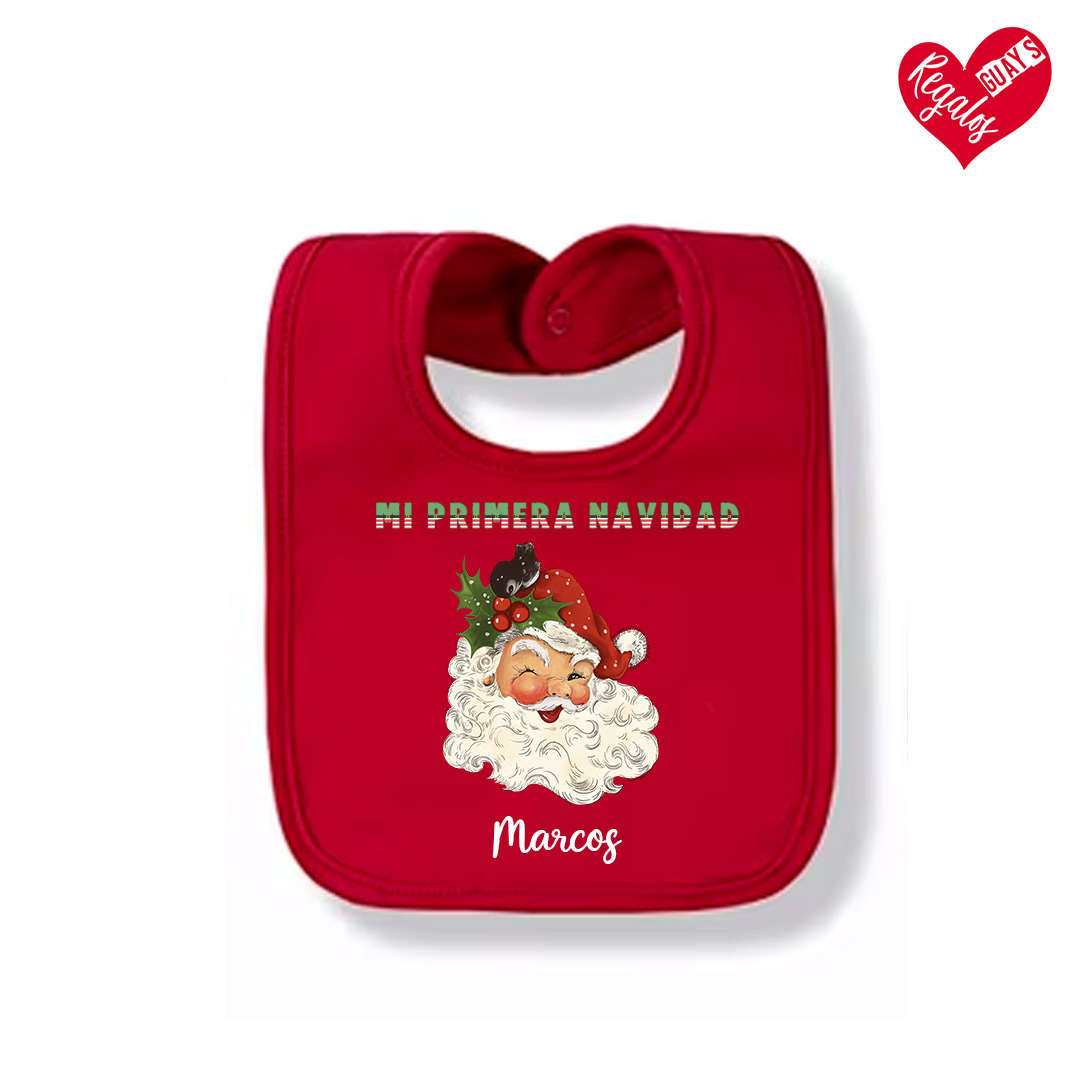 Este encantador babero rojo, decorado con el mensaje «Mi Primera Navidad» y un alegre Papá Noel clásico con detalles de muérdago y gorrito navideño, está diseñado para celebrar una ocasión muy especial. Hecho con materiales suaves y cómodos, es ideal para proteger la ropa de tu bebé mientras luce adorable en sus primeras fiestas navideñas. Perfecto como recuerdo o para tus fotos familiares.