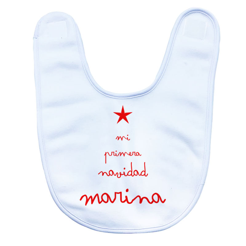 Este babero con cierre velcro diseño “Mi primera Navidad. Modelo Estrella” con Papá Noel y arbol y regalo de Navidad, perfecto para que el bebé luzca un babero muy gracioso y divertido estas Navidades que seguro serán inolvidables …No hay mejor regalo en Navidad que la llegada de un bebé!!