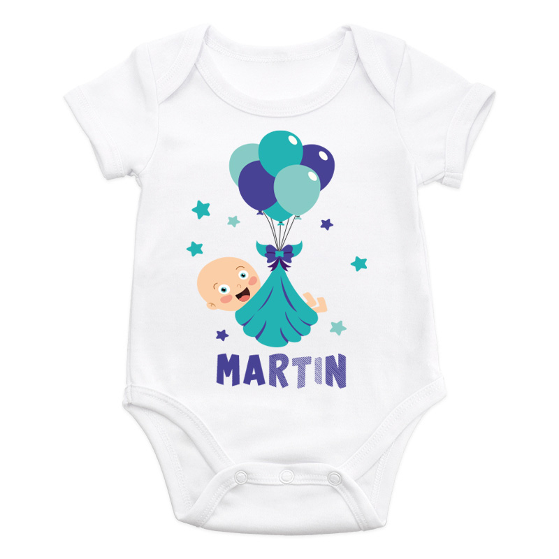 Un body para bebé como este con globos verdes y azules y nombre personalizado es siempre un regalo original y práctico.