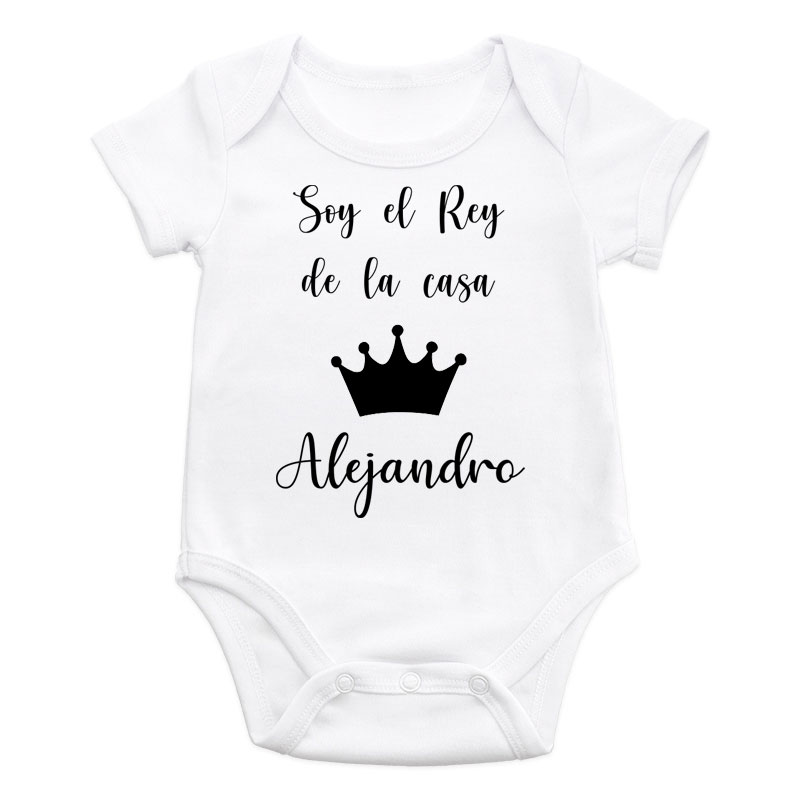 Un body para bebé como este con diseño «Soy el Rey de la casa» y nombre personalizado es siempre un regalo original y práctico.