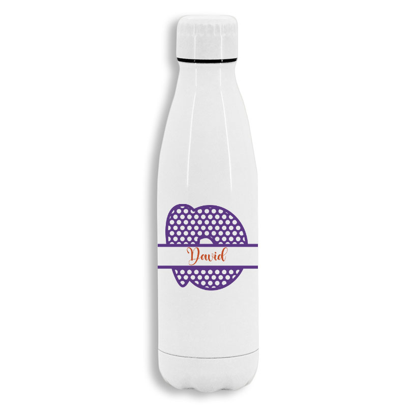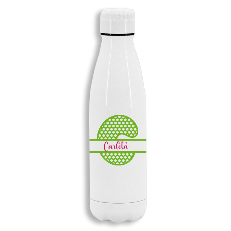 Bidón personalizado de 790 ml de capacidad, con cuerpo acabado en acero inoxidable en color blanco mate personalizada con Inicial y nombre. Con tapón de seguridad. Presentado en atractiva caja de diseño.