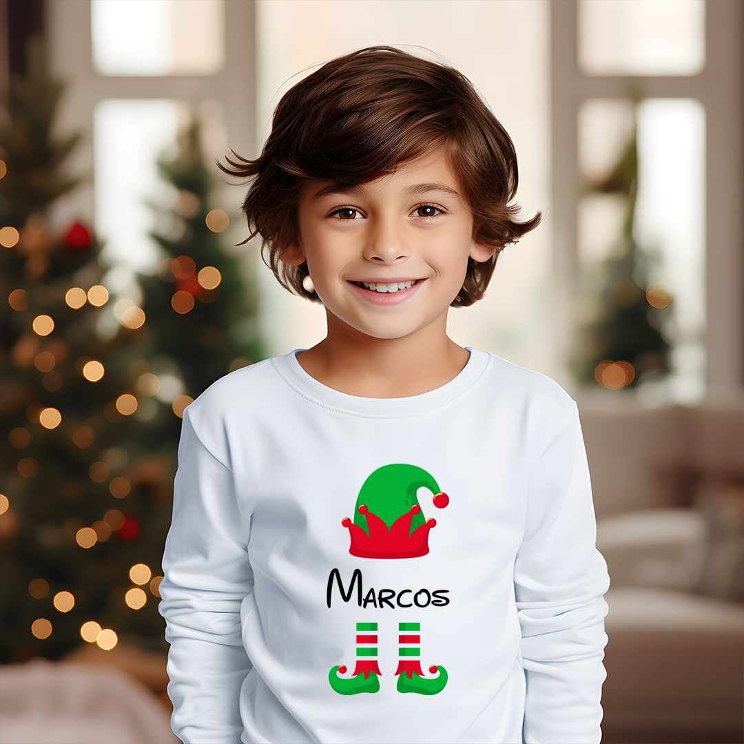 ¡Prepárate para las festividades con nuestra Camiseta personalizada «Elfo de Navidad» de manga larga y color blanco!