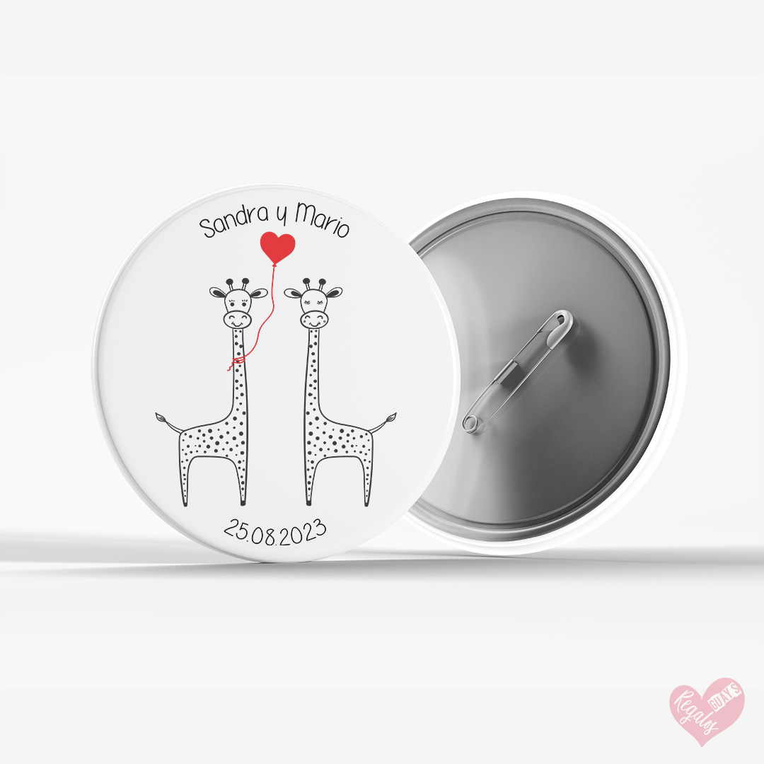 Chapa personalizada para boda «Love Jirafas». Personalizadas con los nombres de los novi@s y fecha de la boda