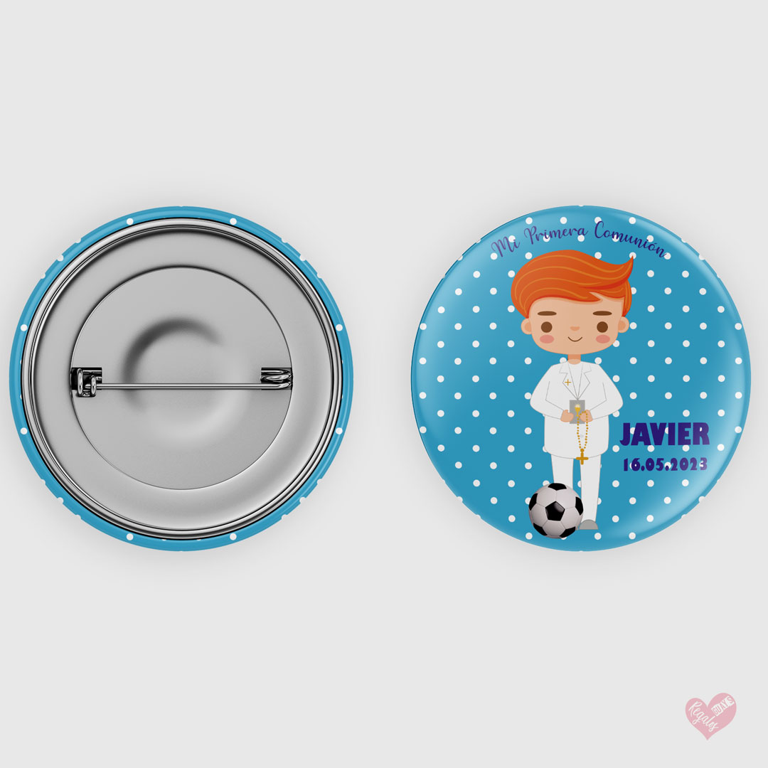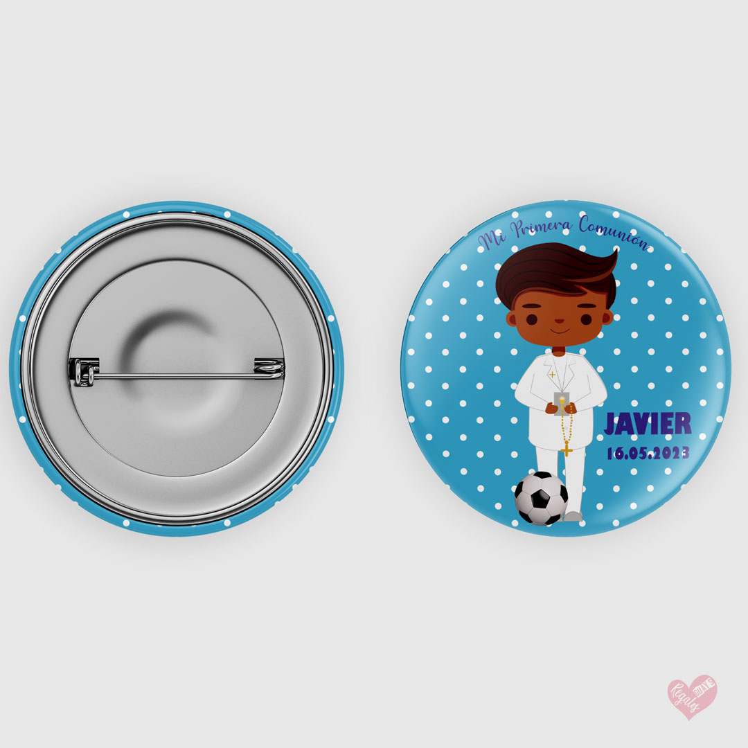 Chapa personalizada Primera Comunión con fondo de topitos