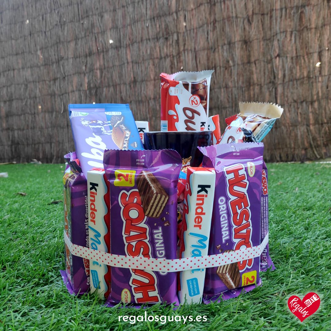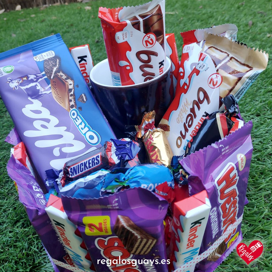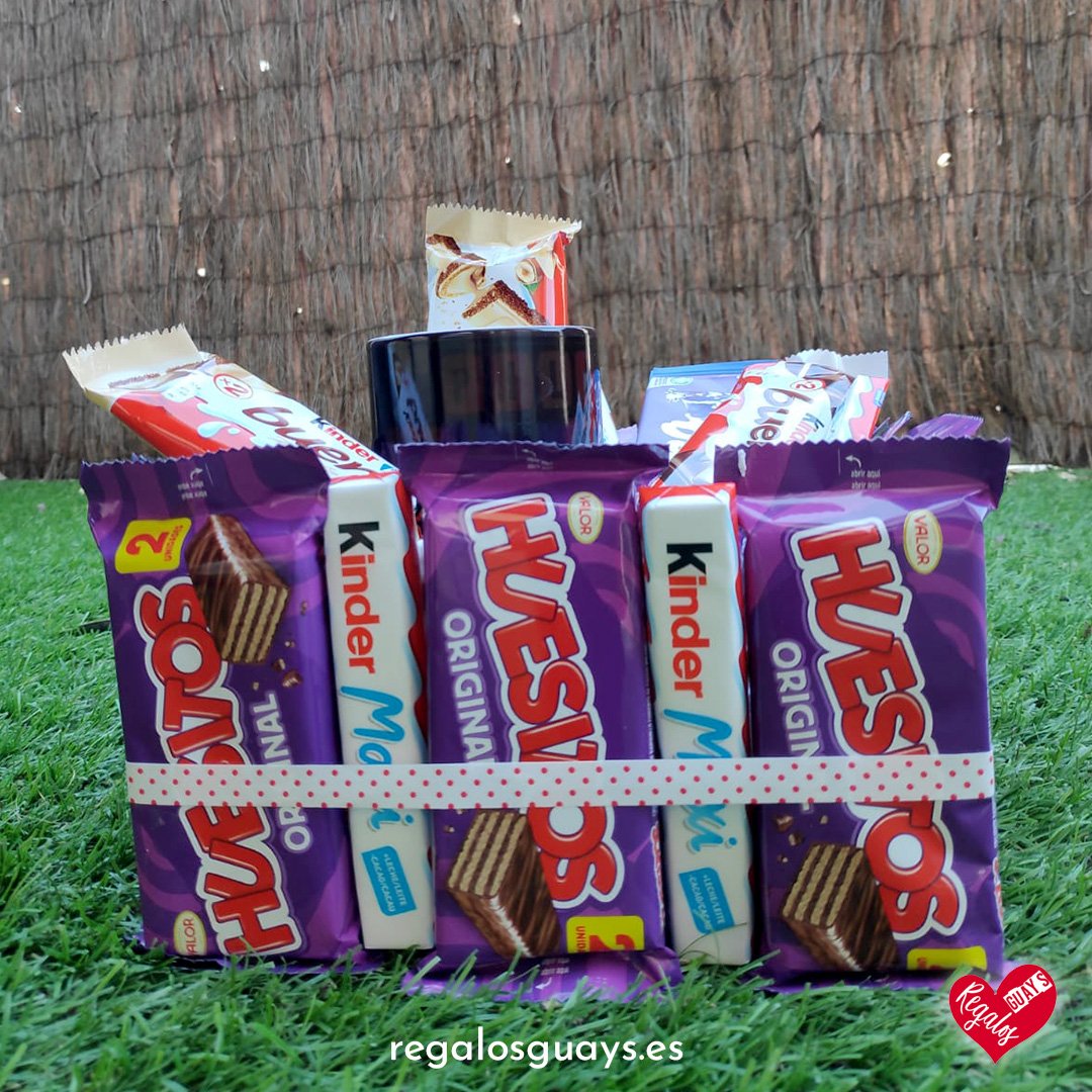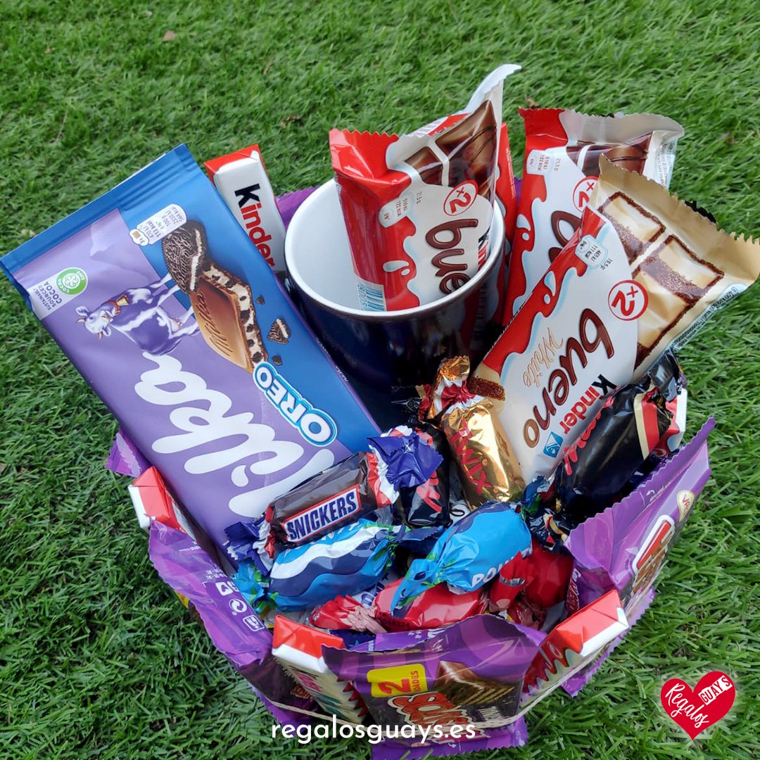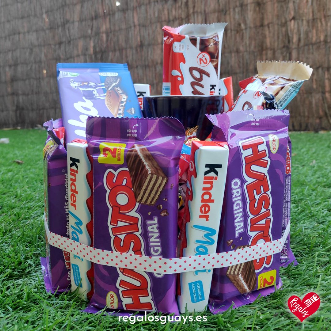 Compuesto por una gran variedad de chocolatinas Kinder Bueno, kinder, Maxi, Lacasitos, Conguitos, Huesitos, etc de chocolates negros y blancos. Tambien incluye una tableta de chocolate Milka oreo.