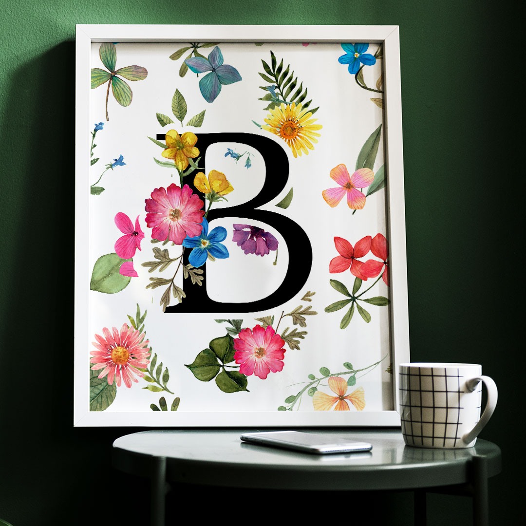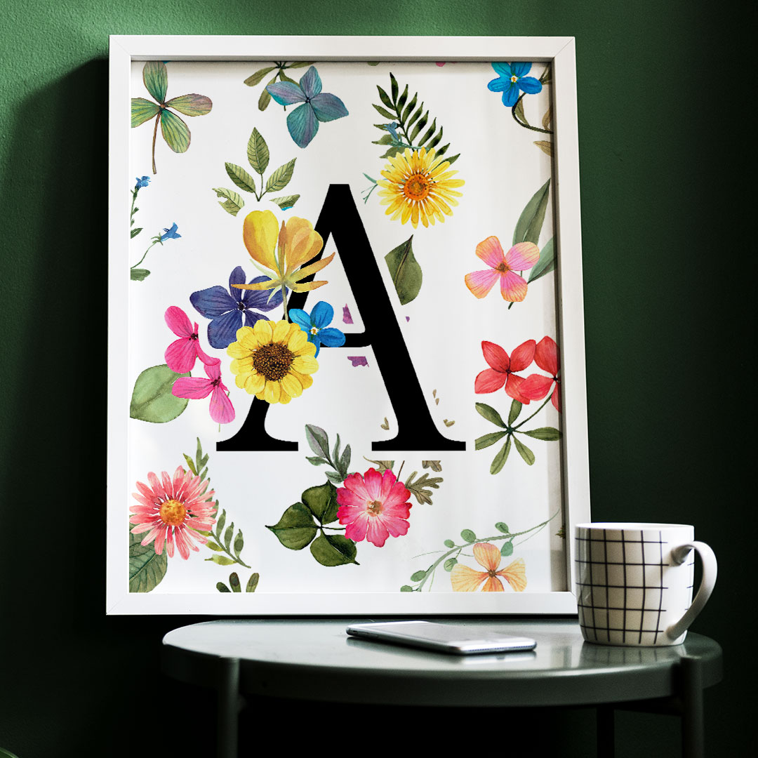 Impreso en papel Extramate Fine Art de 180gr. blanco y con la inicial y con flores de todos los colores.