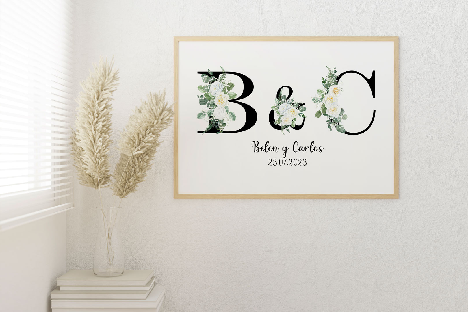 Os presentamos un original cuadro con diseño floral y personalizado con las iniciales de la pareja, nombres y fecha del aniversario o boda.