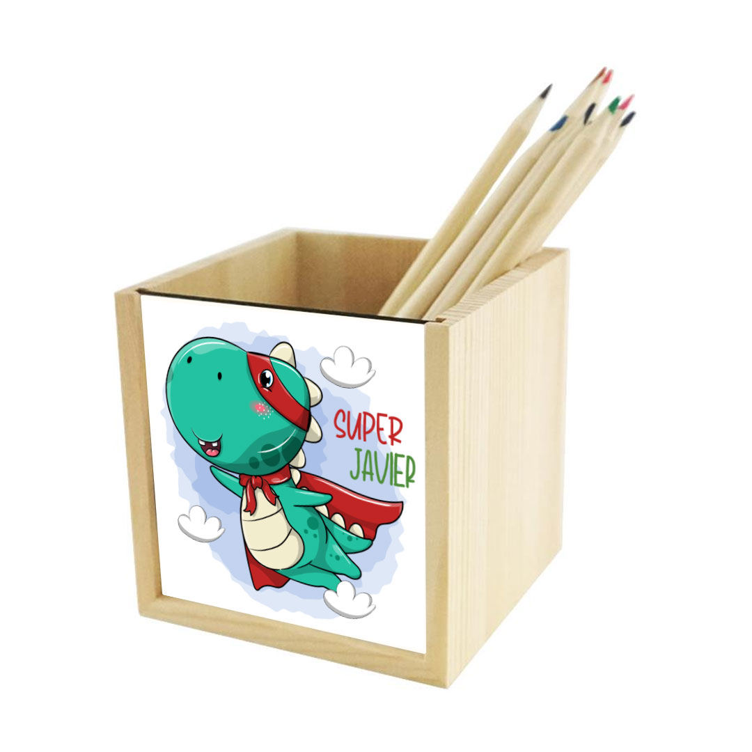 Portalápices cuadrado de madera con acabado blanco brillante modelo personalizado «SuperDino»