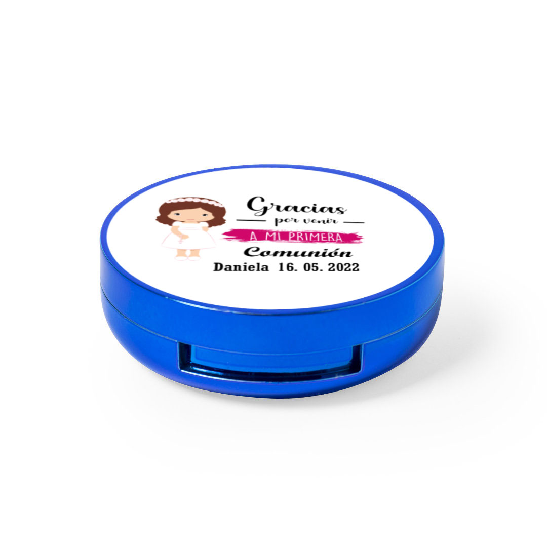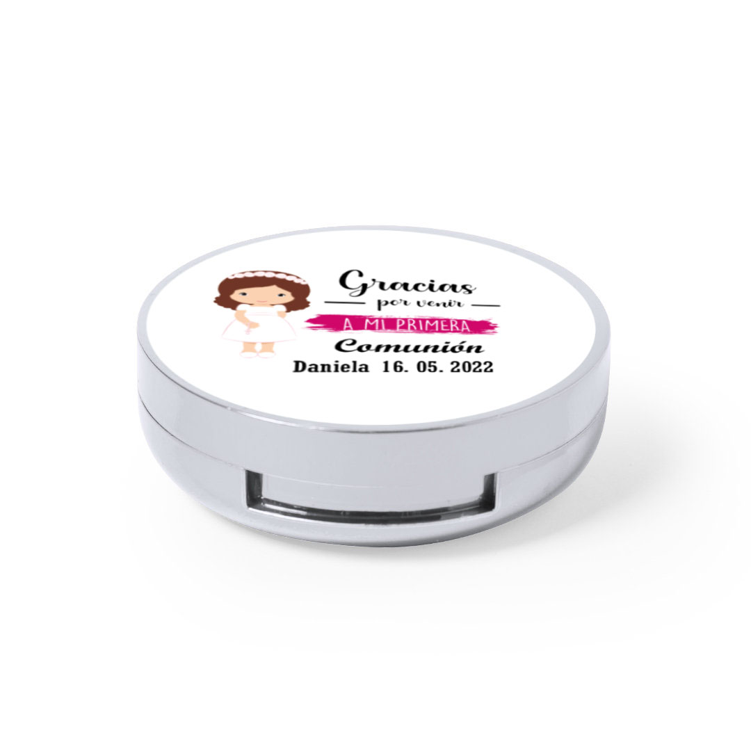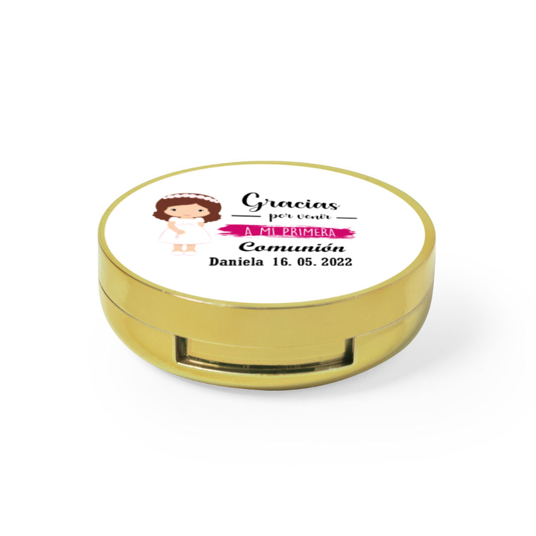 Este regalo de Primera Comunión «bálsamo labial con espejo» es un detalle para los invitados de la primera comunión de tu hijo o hija. Personalizado con nombre y fecha.