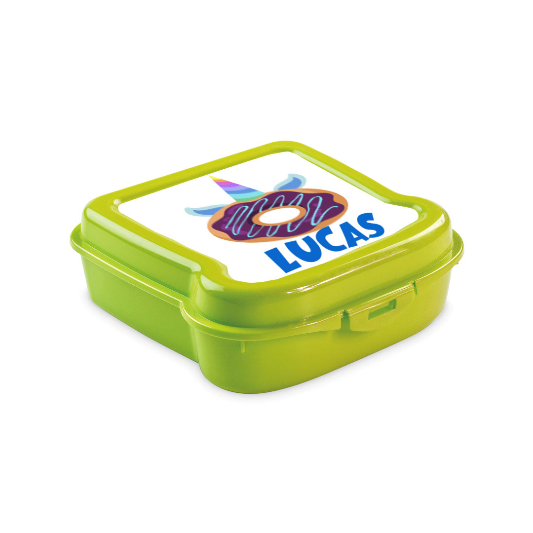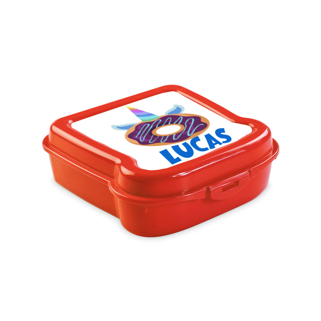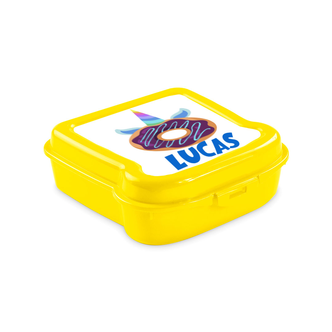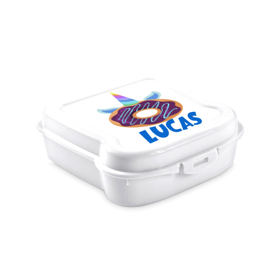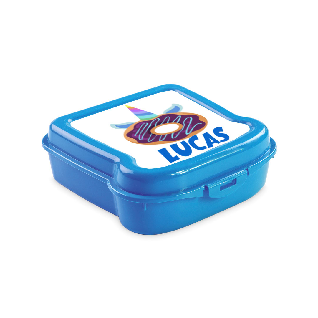 Fiambrera para sandwich personalizada con diseño de donut unicornio azul.