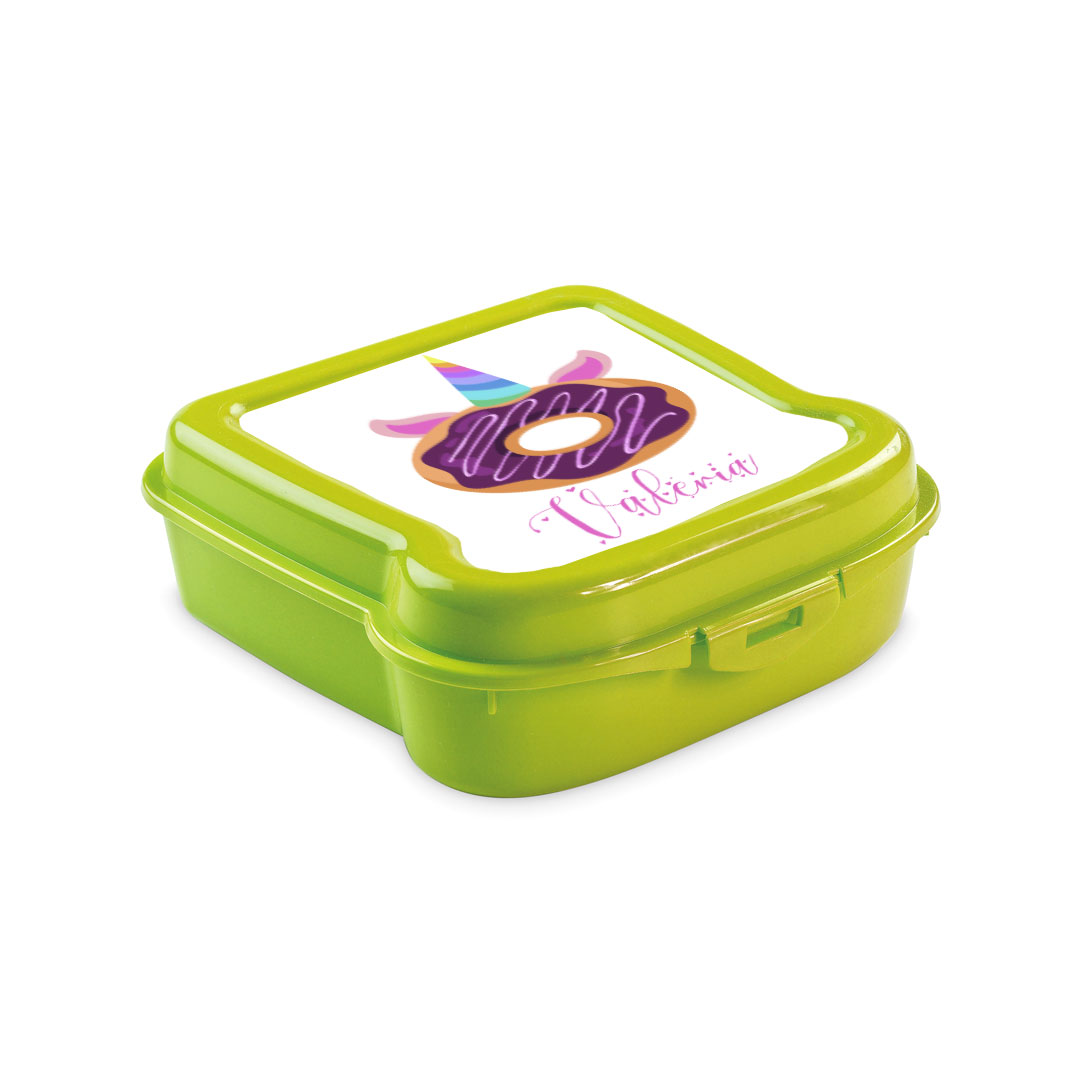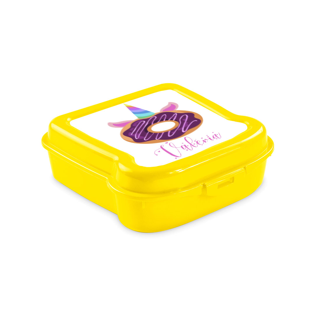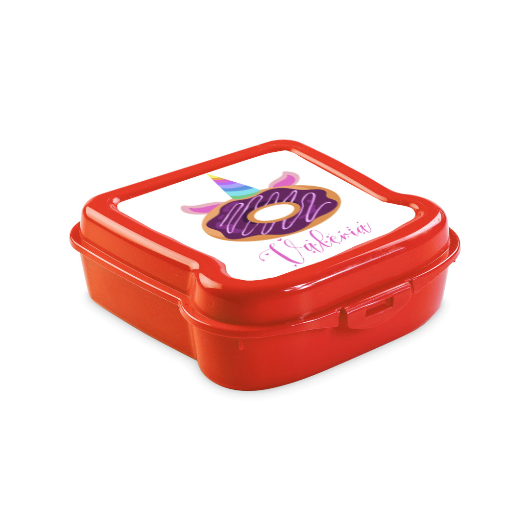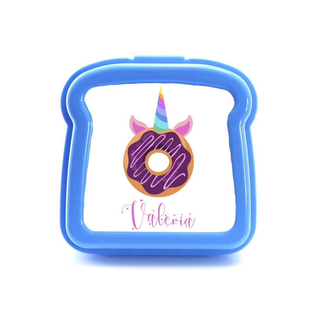 Fiambrera para sandwich personalizada con diseño de donut unicornio rosa.