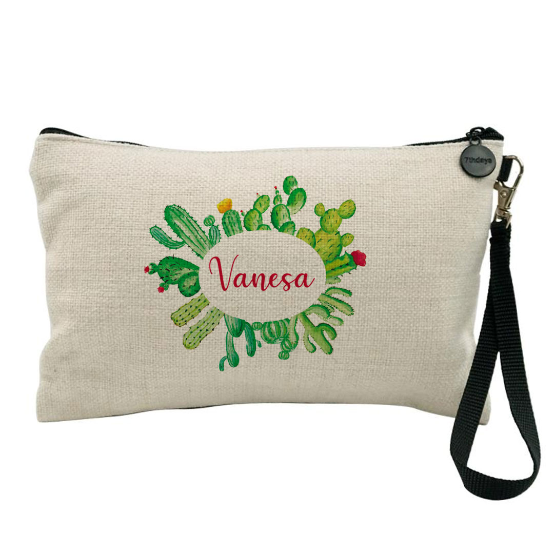 Neceser de tejido símil lino con nombre personalizado modelo «Cactus», de poliéster 100% de color beige jaspeado.