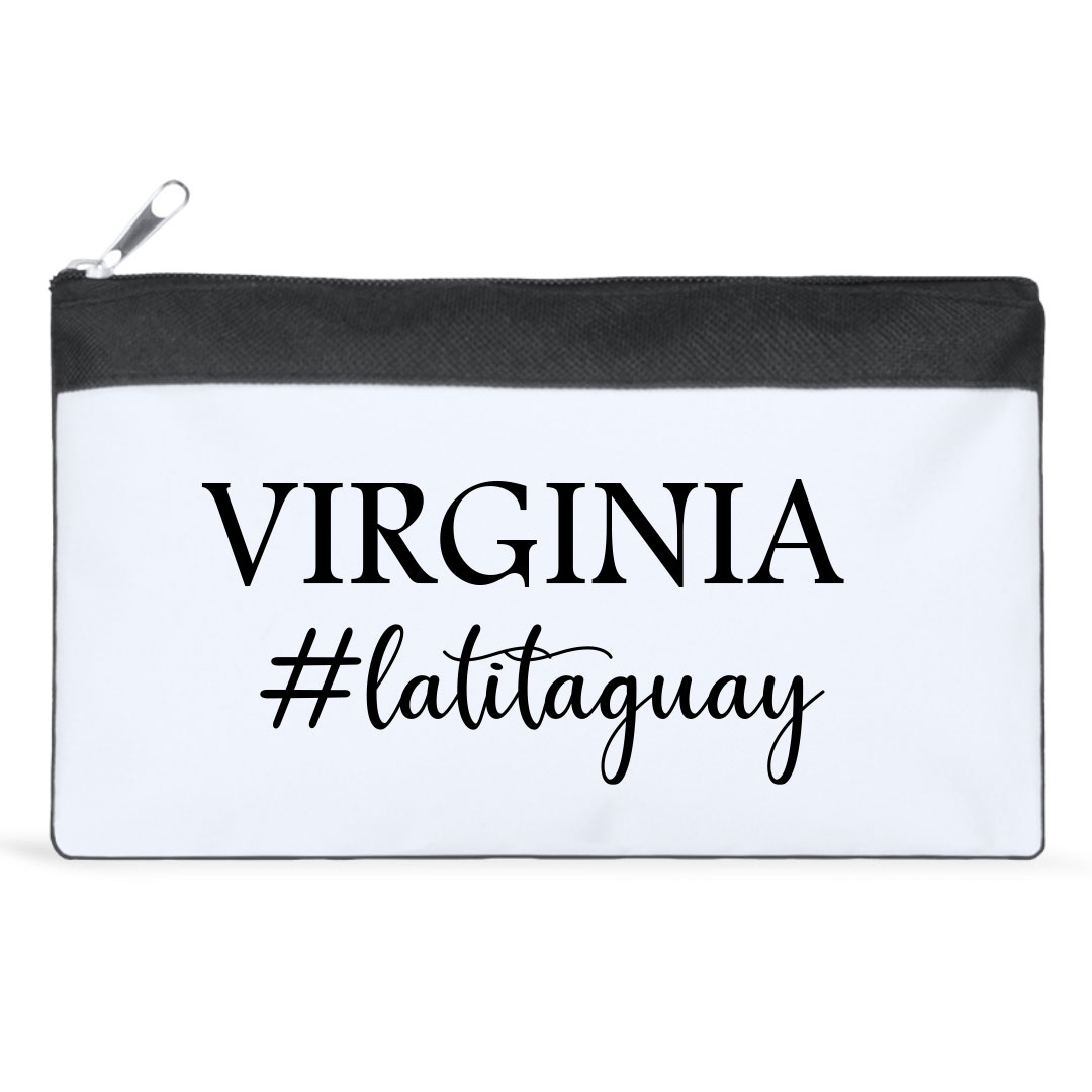 Neceser estuche para maquillaje o para guardar plumas, lápices, etc con nombre personalizado «La tita guay», de poliéster 100% en combinación de colores negro y blanco.