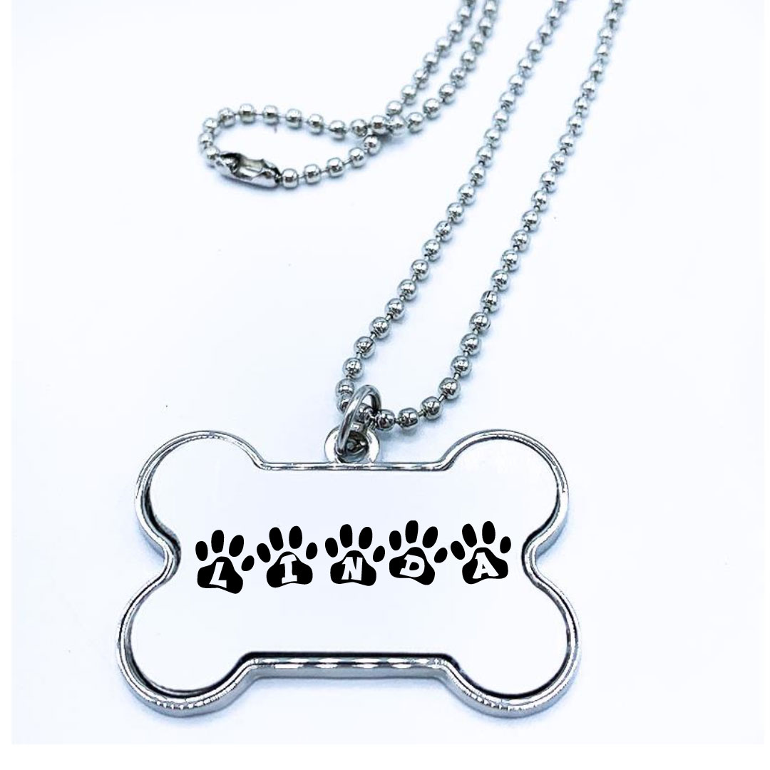 Placa en forma de hueso, ideal para identificación de mascotas.