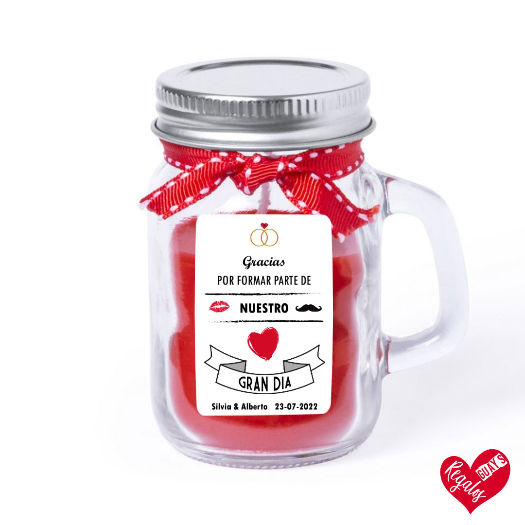 Este detalle de boda es una vela aromática con diseño personalizado y es un obsequio para los invitados de vuestra boda. Personalizado con nombres y fecha.