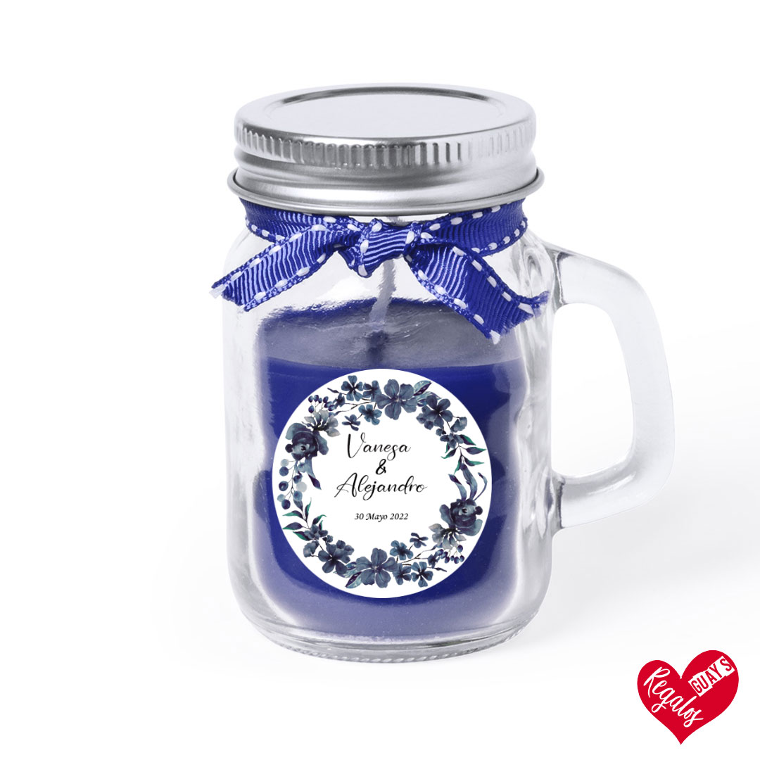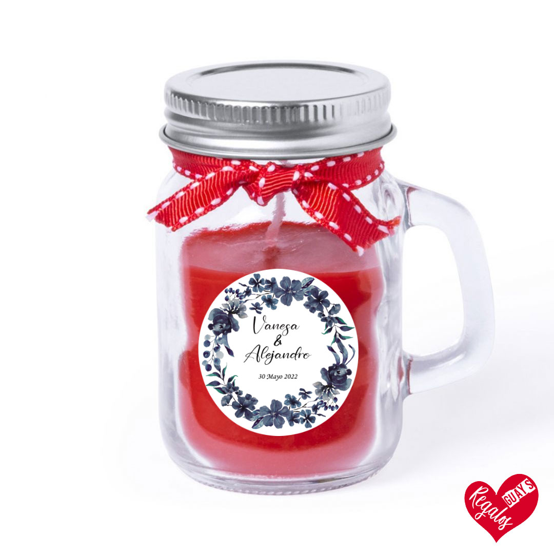 Este detalle de boda es una vela aromática con diseño personalizado y es un obsequio para los invitados de vuestra boda. Personalizado con nombres y fecha.