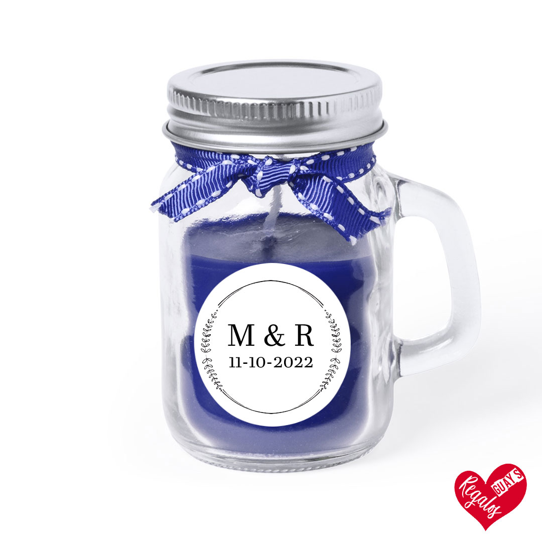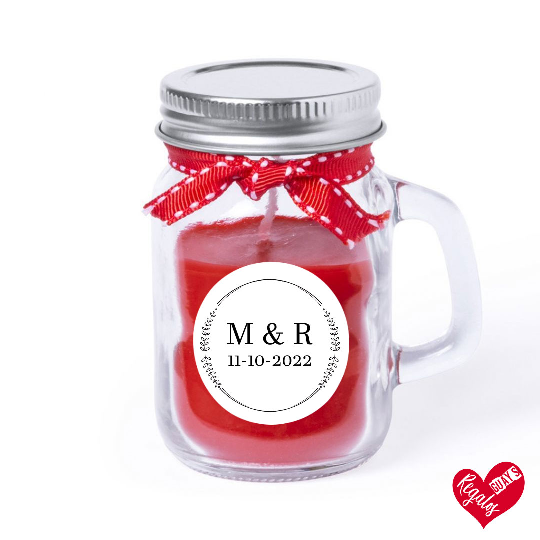 Este detalle de boda es una vela aromática con diseño personalizado y es un obsequio para los invitados de vuestra boda. Personalizado con nombres y fecha.