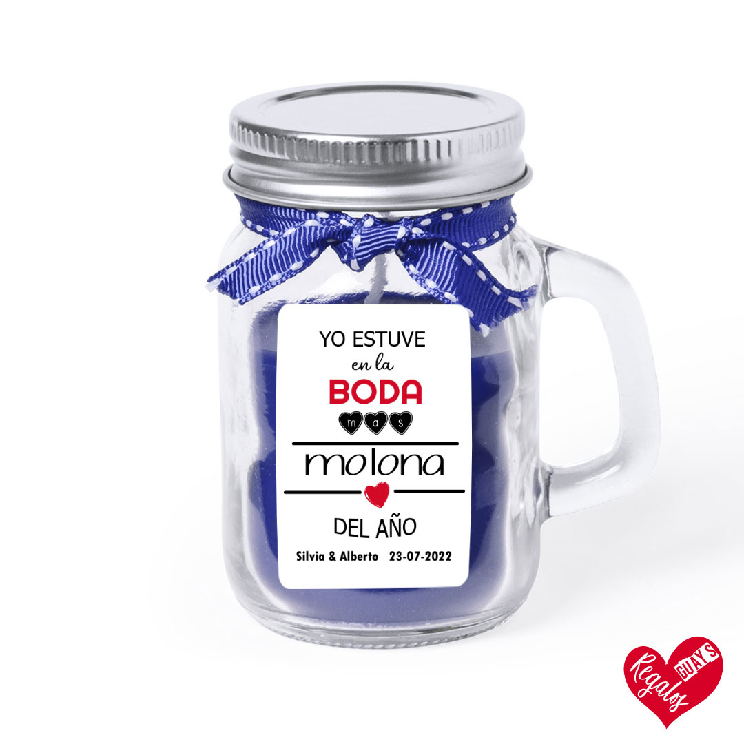 Este detalle de boda es una vela aromática con diseño personalizado y es un obsequio para los invitados de vuestra boda. Personalizado con nombres y fecha.